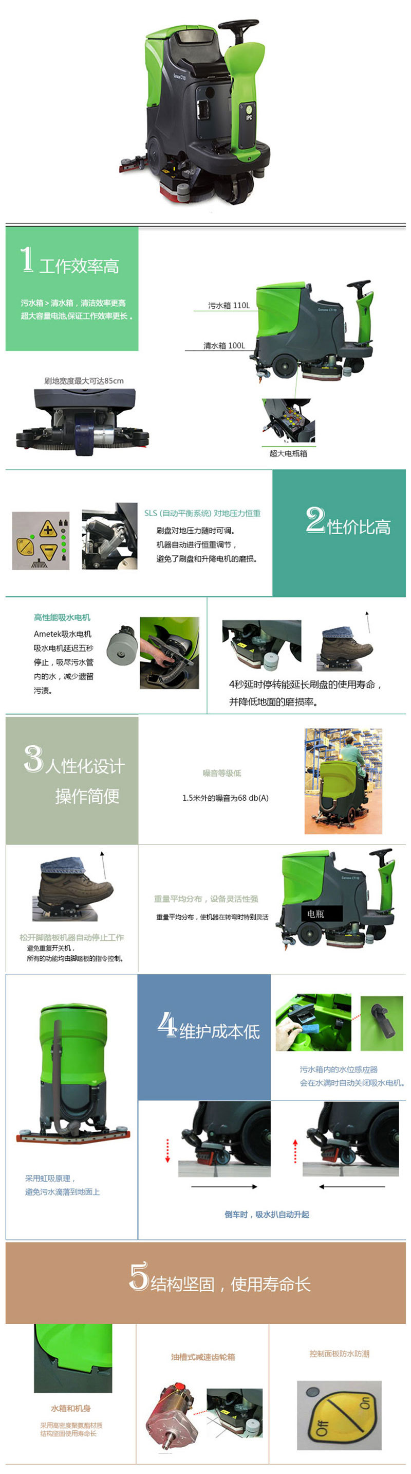 產(chǎn)品介紹:CT110駕駛式洗地機,刷盤由兩個獨立馬達驅(qū)動,且壓力可以調(diào)節(jié),以達到最佳的清潔效果。自動平衡系統(tǒng)(SLS),可確保刷盤在不平整的地面,也能保持相同的刷盤壓力。