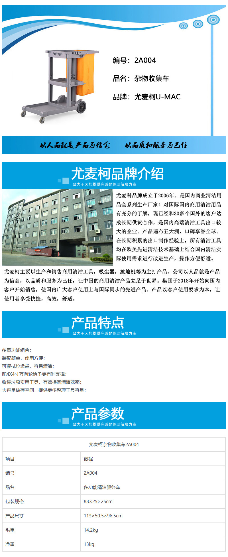多重功能組合;裝配簡單,使用方便;可擦拭垃圾袋,容易清潔;配4X4寸萬向輪給予更有利支撐;收集垃圾實用工具,有效提高清潔效率;大容量儲存空間,提供更多整理工具容量;