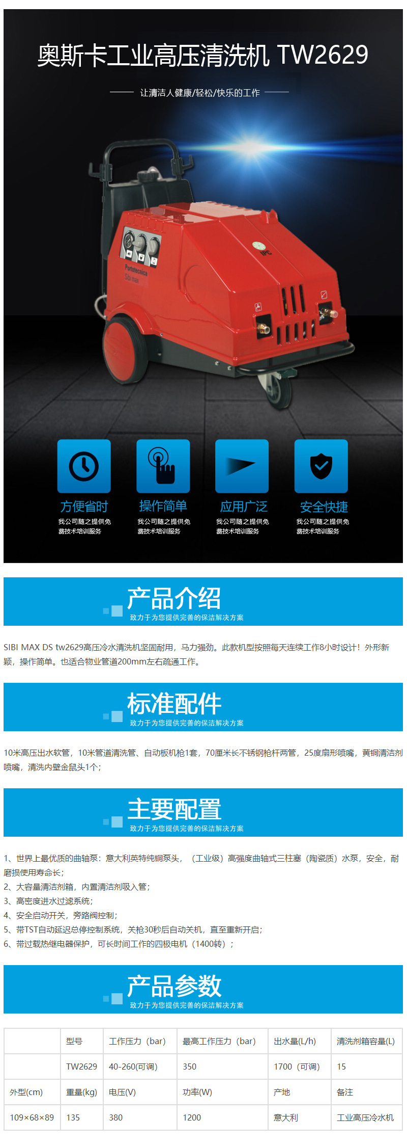 SIBI MAX DS tw2629高壓冷水清洗機堅固耐用,馬力強勁。此款機型按照每天連續(xù)工作8小時設(shè)計!外形新穎,操作簡單。也適合物業(yè)管道200mm左右疏通工作。